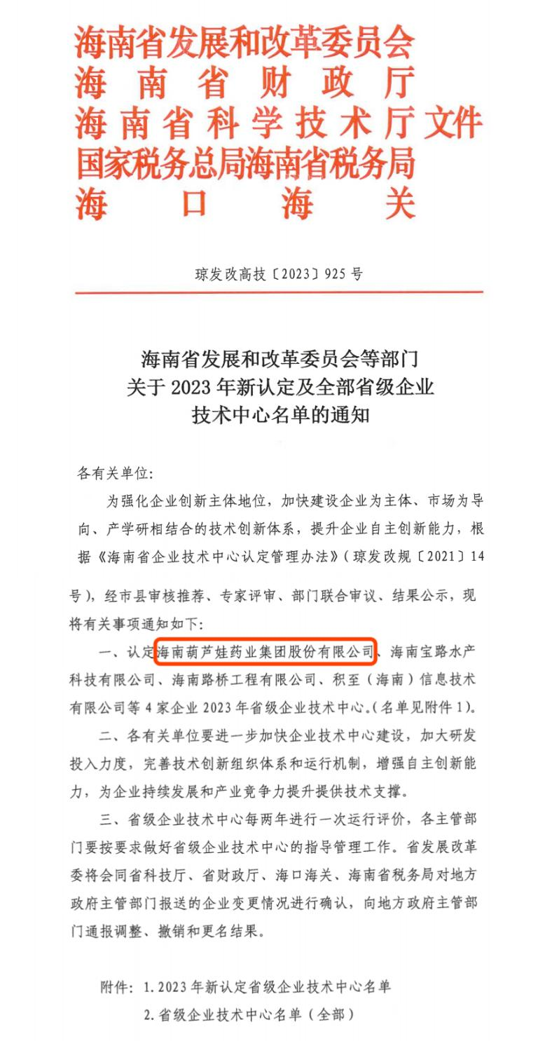 近日,海南省发改委等多部门联合公布了《关于2023年新认定及全部省级企业技术中心名单的通知》,其中,海南97国际药业集团股份有限公司成功通过评审,被认定为省级企业技术中心,是本次获批的4家企业之一。